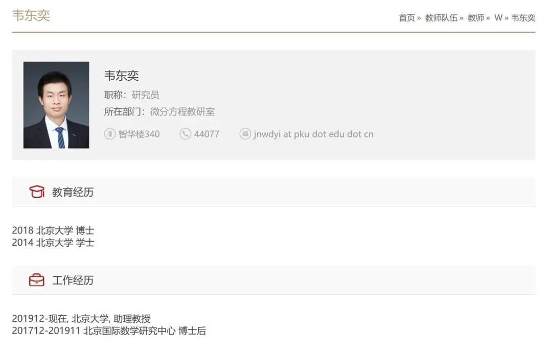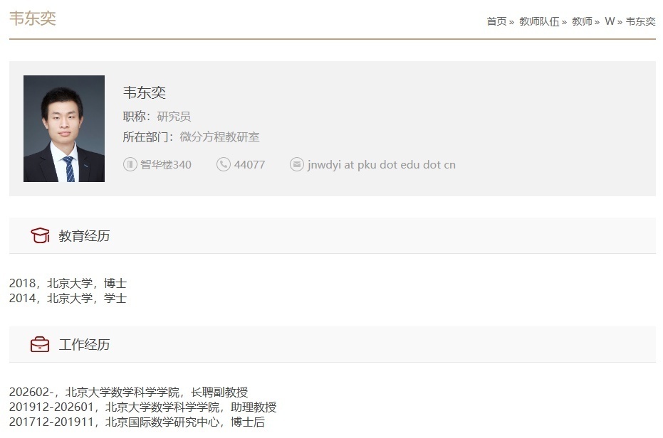 韦东奕个人信息(图源:北京大学数学科学学院官网)