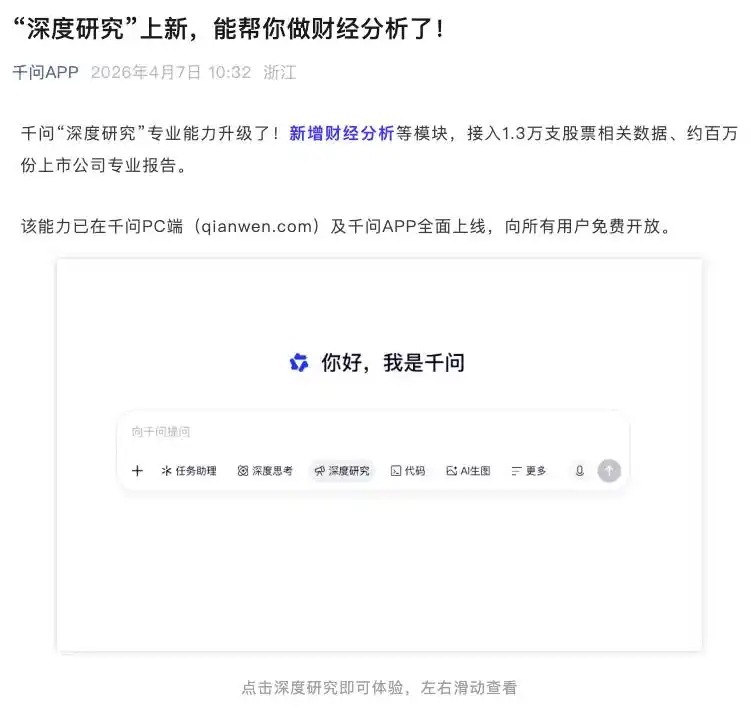 4月7日,千问App官方微信公众号发布消息称,千问“深度研究”专业能力完成升级,新增财经分析等模块,正式接入1.3万只股票的实时行情以及约百万家上市公司的财报数据。几乎同一时间,Kimi也宣布接入了同花顺iFinD金融数据库。
