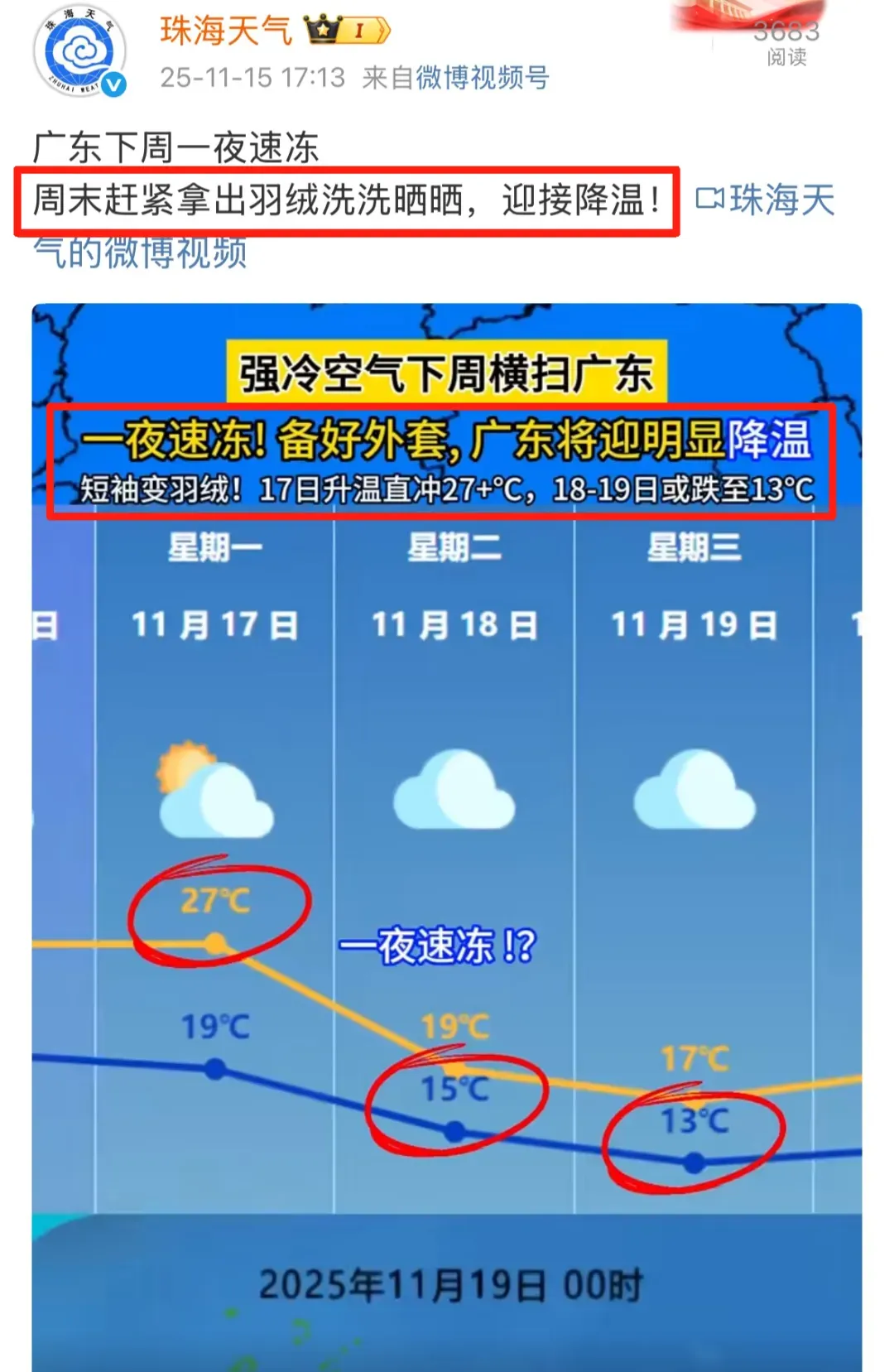 珠海市气象台预计,强冷空气前锋将于下周一(17日)夜间率先抵达珠海,届时气温显著下降,天气阴冷,最低气温逐日下降