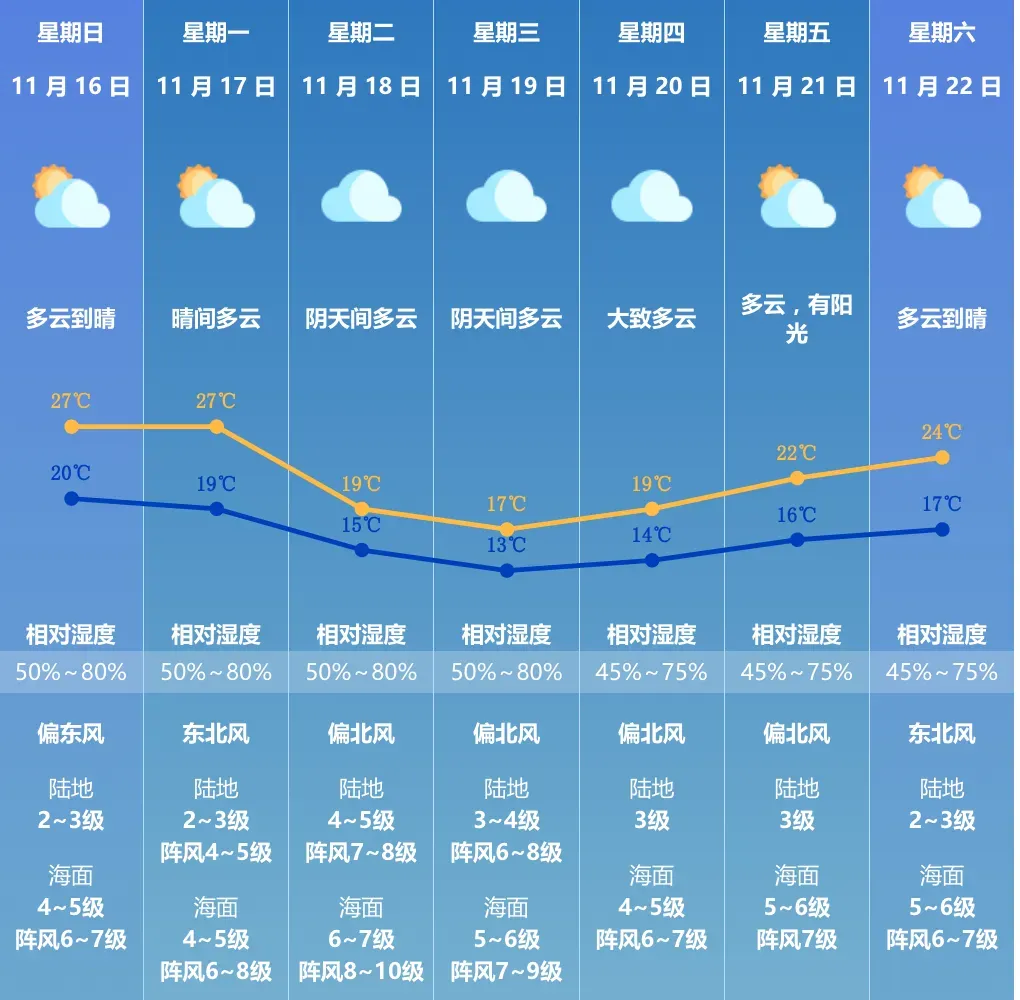 珠海市气象台预计,16-17日,我市多云到晴,空气干燥;17日晚至20日,受强冷空气影响,气温显著下降,北风加大,天气阴冷;21-22日,阳光增多,气温回升。